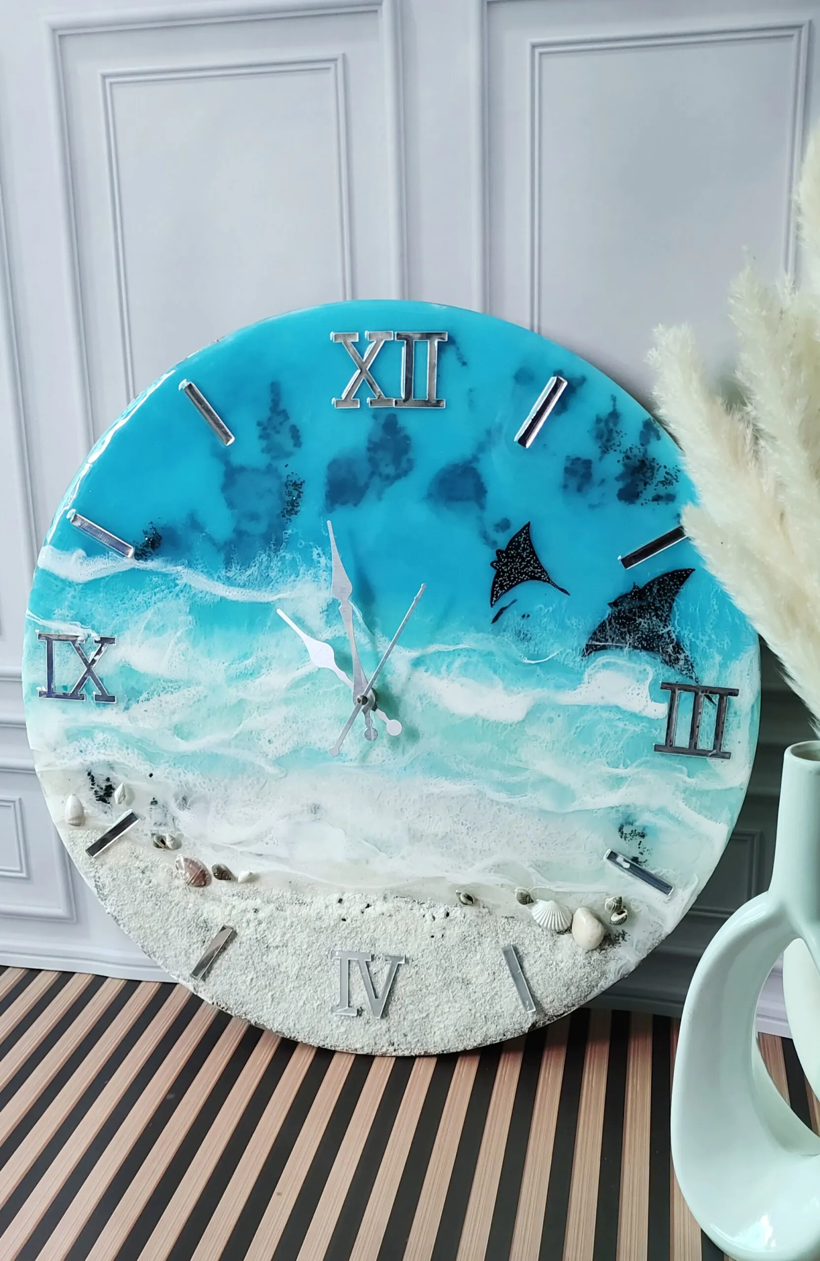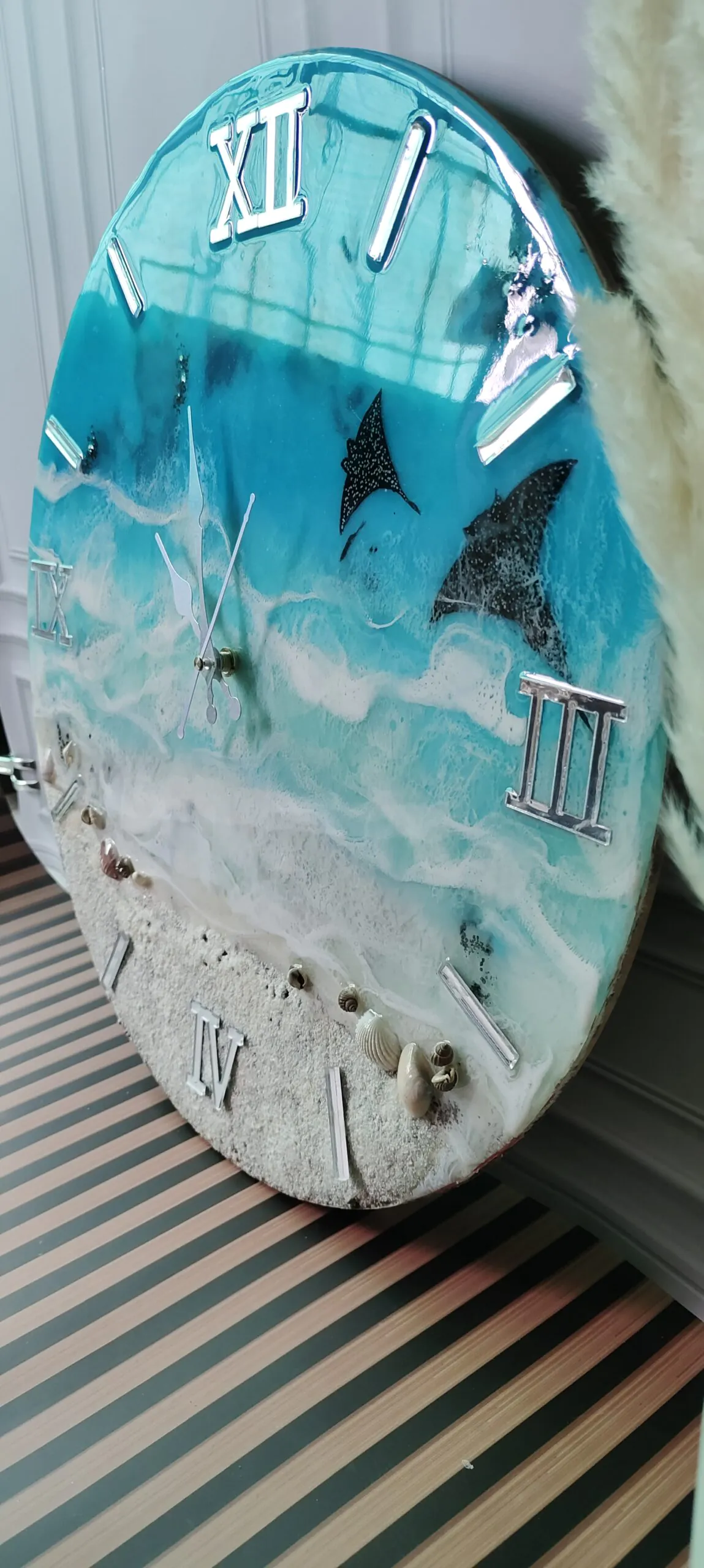 The glossy resin surface enhances the oceanic design, adding a touch of sophistication to any room.